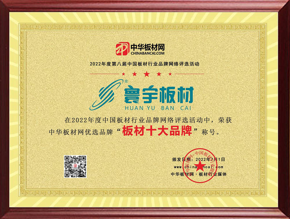 助力板材企業(yè)品牌成長,打造板材行業(yè)品牌標(biāo)桿。中華板材網(wǎng)初心如磐,同心同路同行。2022年7月1日,第八屆2022年度中國板材行業(yè)品牌網(wǎng)絡(luò)評選活動(dòng)圓滿收官,各項(xiàng)排行榜重磅發(fā)布!祝賀寰宇板材榮獲2022年度中華板材網(wǎng)優(yōu)選榜“板材十大品牌”稱號(hào)。